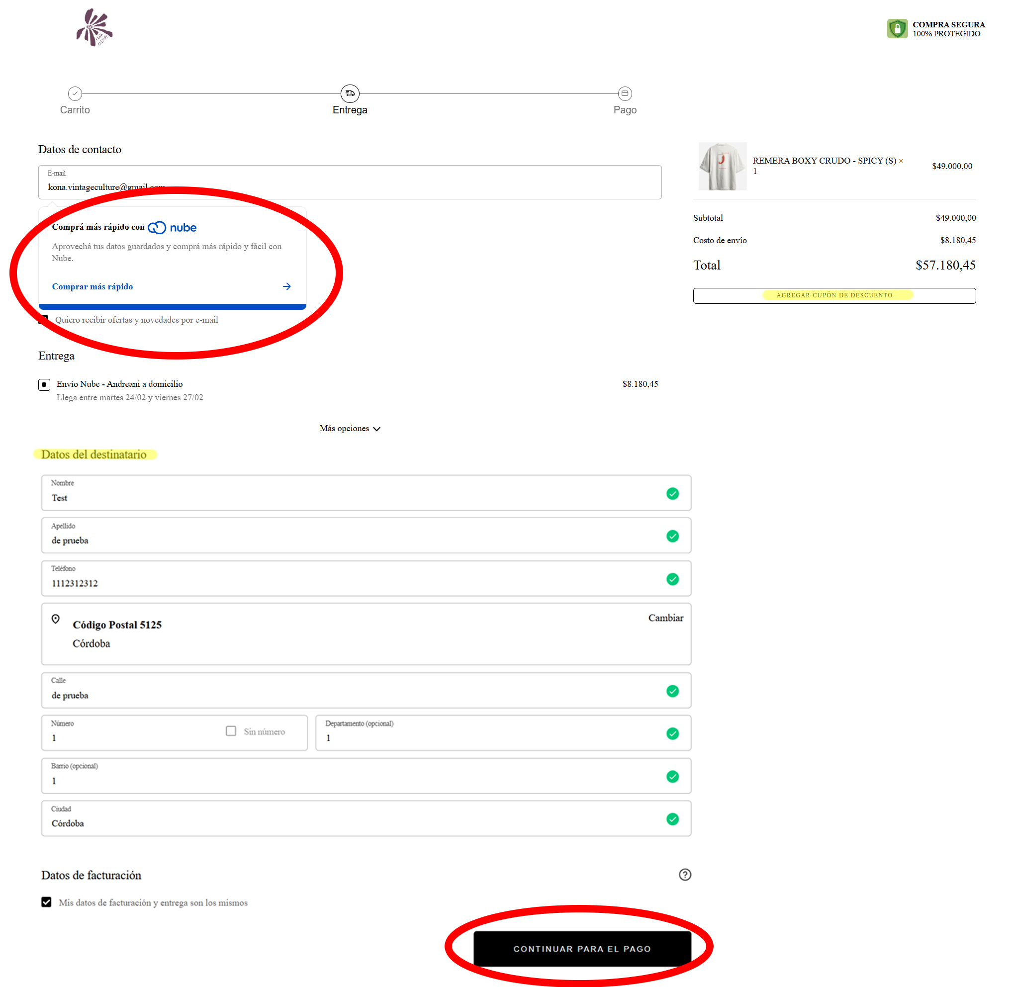 Una vez completa la información de envío (datos del destinatario), vas a presionar sobre el botón de Continuar para el pago.