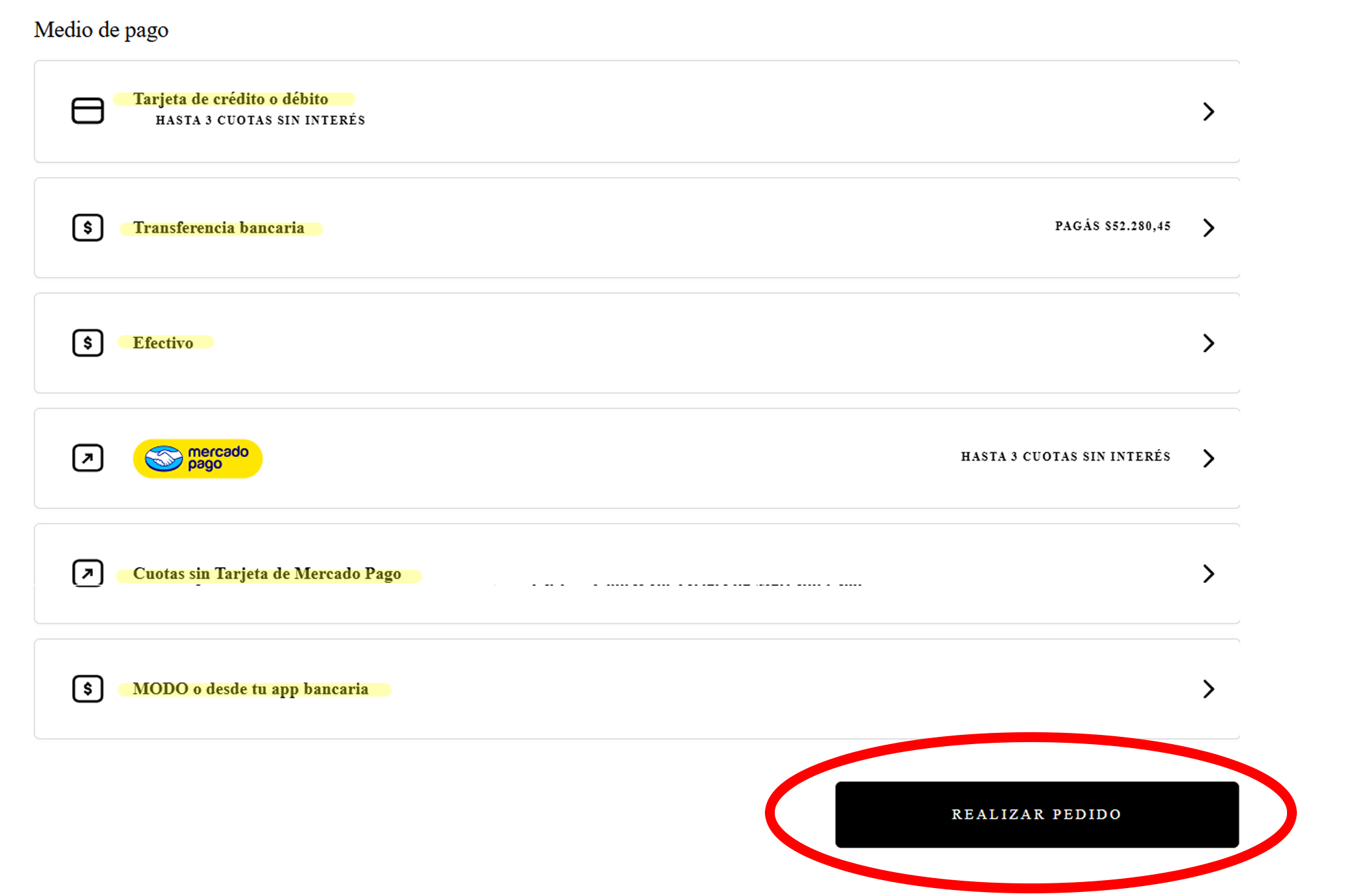 5. Último paso: seleccioná el medio de pago que más te convenga, completá la información necesaria en caso de seleccionar el pago con una tarjeta de débito/crédito, ¡Y listo! ya compraste tu prenda en Kona Culture.