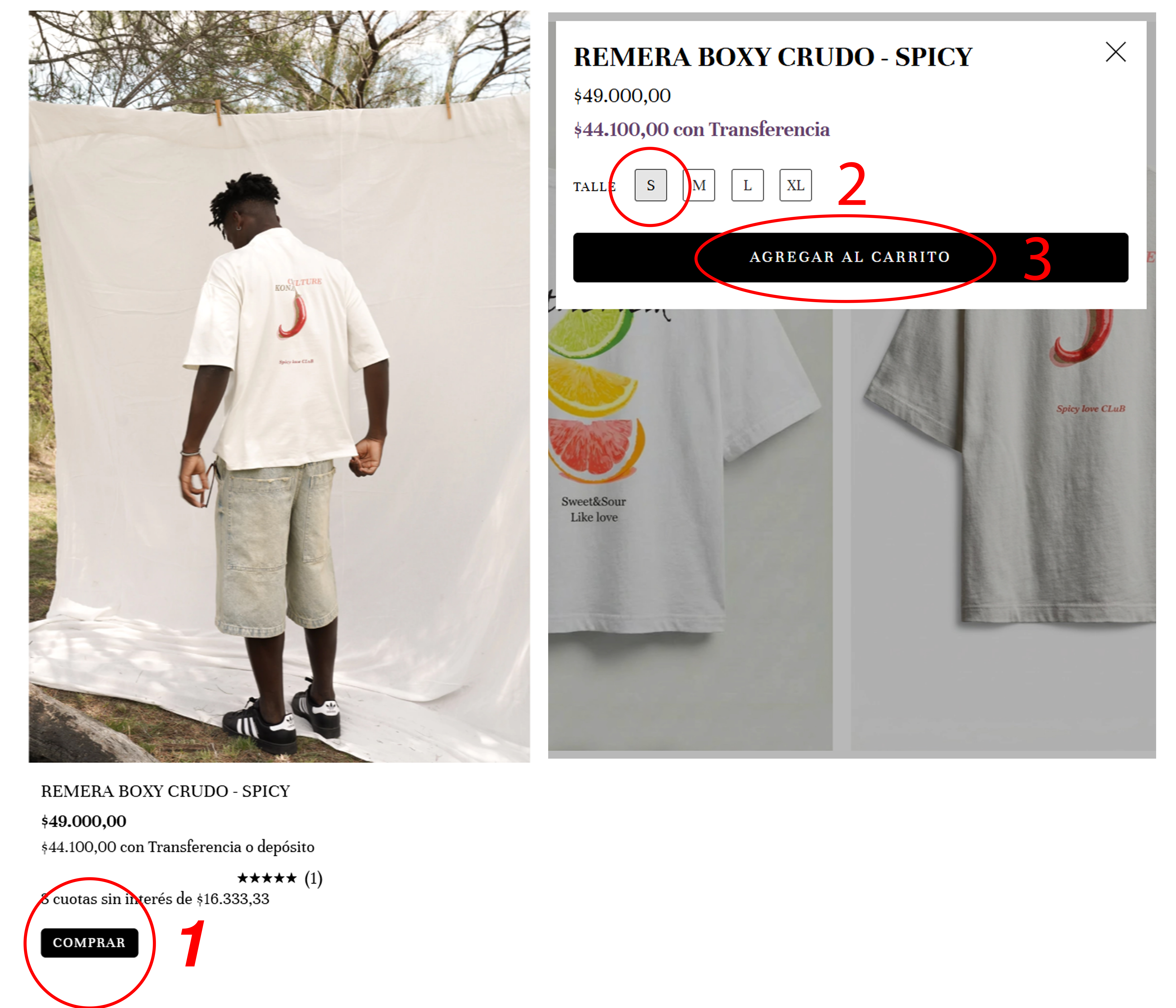 2. Una vez elegido el producto, podés: O bien iniciar una compra rápida desde el botón comprar, donde vas a poder elegir el talle y agregar al carrito: