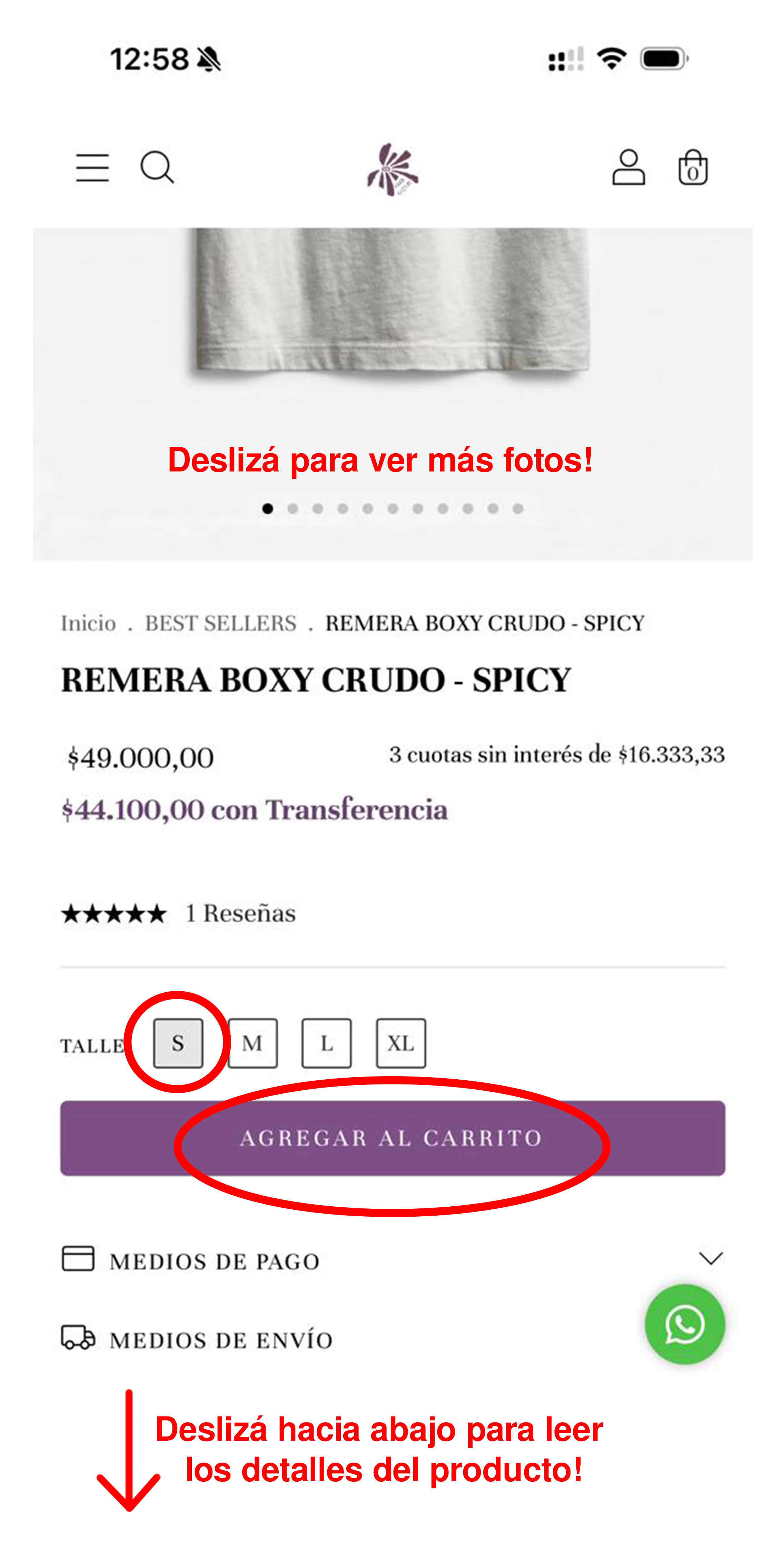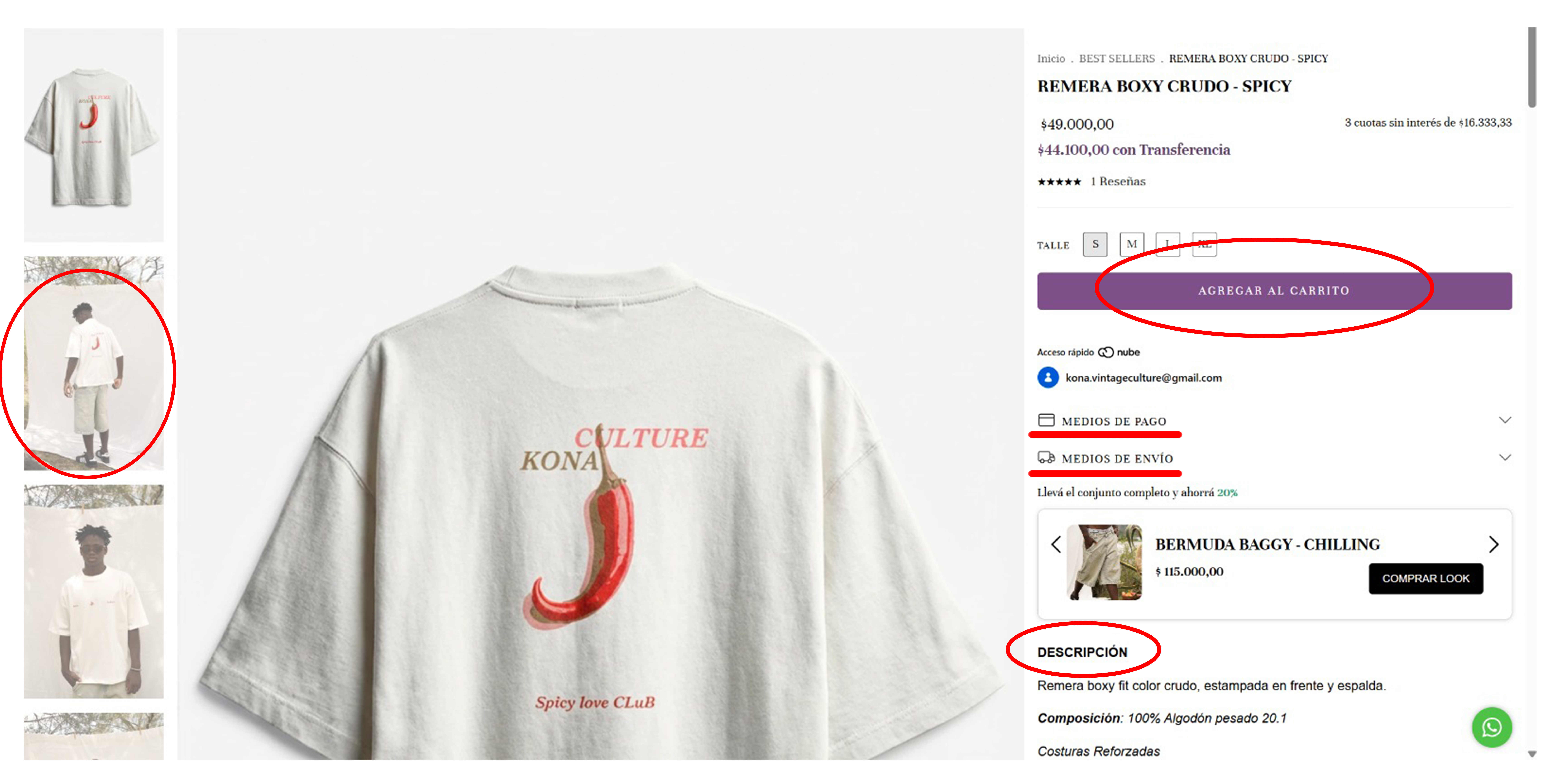 O podés ingresar al producto y ver con mayor detalle las fotos, descripción, guía de talles, medios de pago, cotizar tu envío y agregar al carrito.