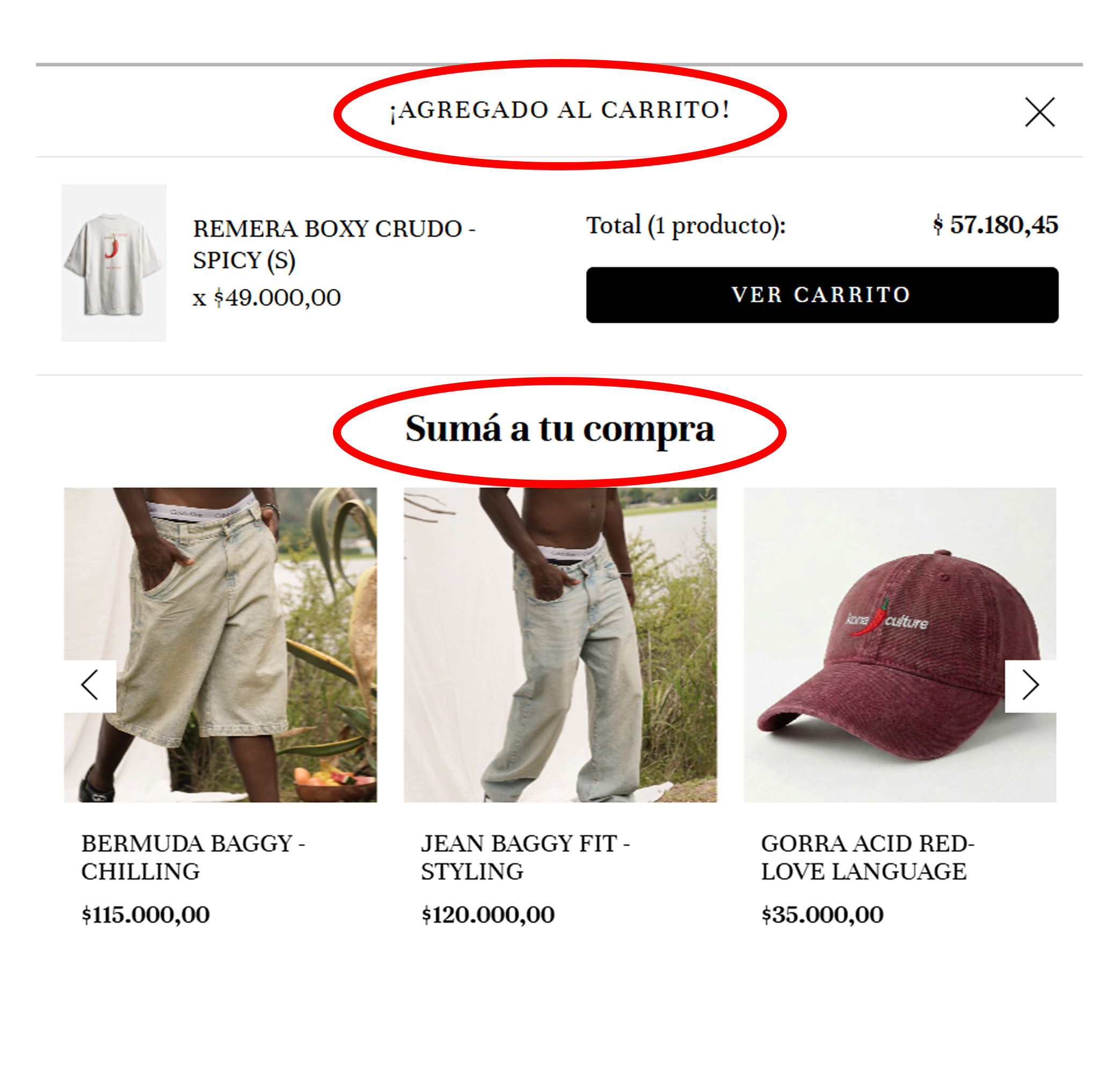 3. Una vez agregado el producto al carrito, te vas a encontrar con la opción de poder sumar alguna otra prenda que te interese para llevarte un outfit completo de Kona Culture o ver tu carrito y seguir con tu compra.